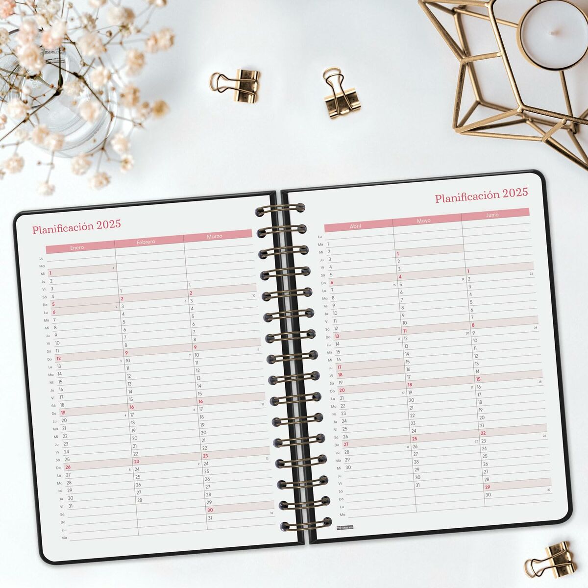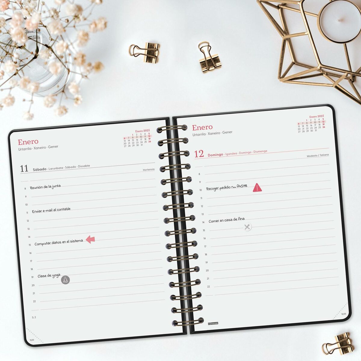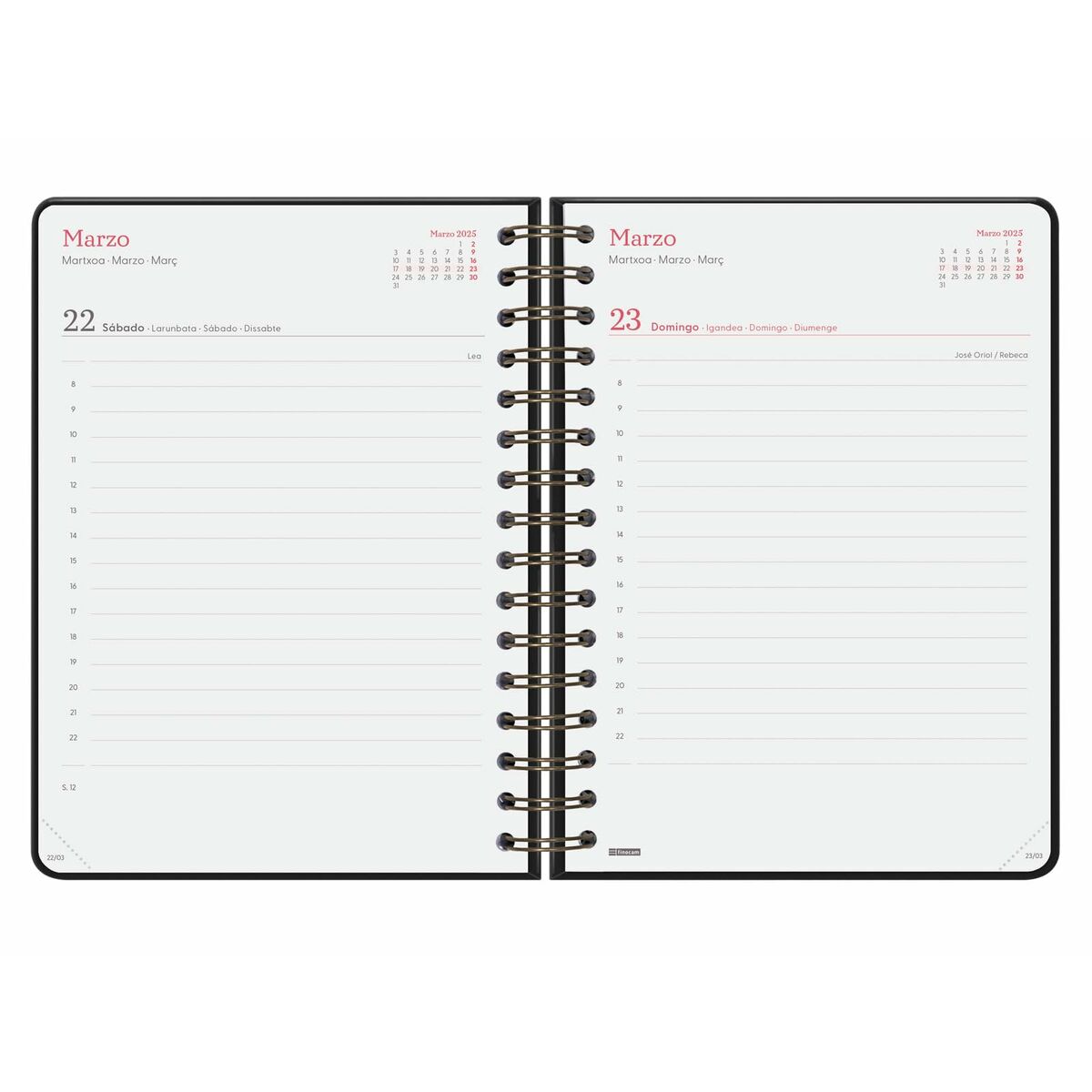 - **Lingua e qualità della carta:** Il punto debole principale per un utente italiano è che l'agenda è interamente in lingua spagnola, inclusi i giorni della settimana e le festività. Inoltre, la grammatura di 70 g/m² è relativamente bassa; questo tipo di carta potrebbe causare effetti di "ghosting" (l'inchiostro che si intravede sul retro del foglio) o addirittura trapassare la pagina se si utilizzano penne stilografiche o con inchiostro molto liquido.