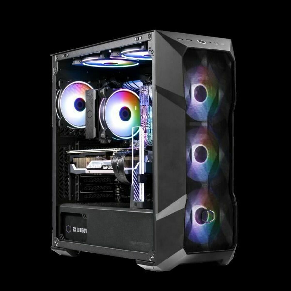 * **Eccellente flusso d'aria e estetica accattivante:** Dotato di un pannello frontale in mesh e tre ventole ARGB da 120mm preinstallate (con illuminazione multicolore e retroilluminazione), garantisce un'ottima ventilazione e un look moderno, ulteriormente esaltato dal pannello laterale in vetro temperato. I filtri anti-polvere contribuiscono a mantenere pulito l'interno.