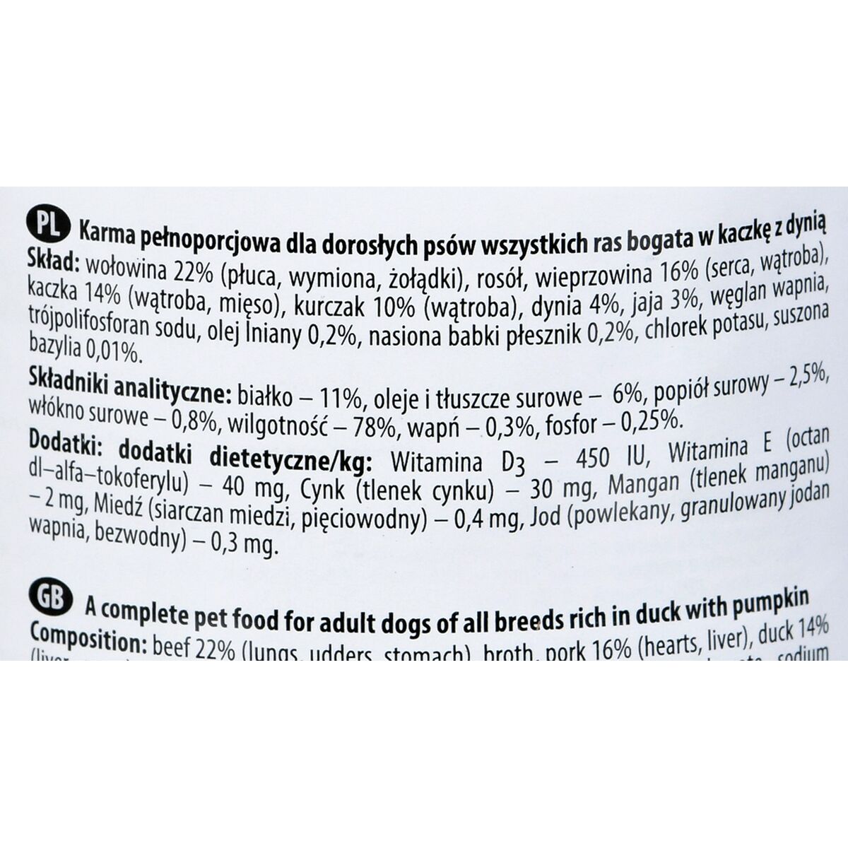 - **Ingredienti di alta qualità e ricetta ricca di carne:** La ricerca basata sull'EAN conferma che il prodotto contiene un'alta percentuale di carne e derivati animali (circa il 62%), specificando le fonti (anatra, maiale, pollo, manzo) e le parti utilizzate (cuore, fegato, stomaco). Questo indica una buona trasparenza e un elevato valore biologico delle proteine.