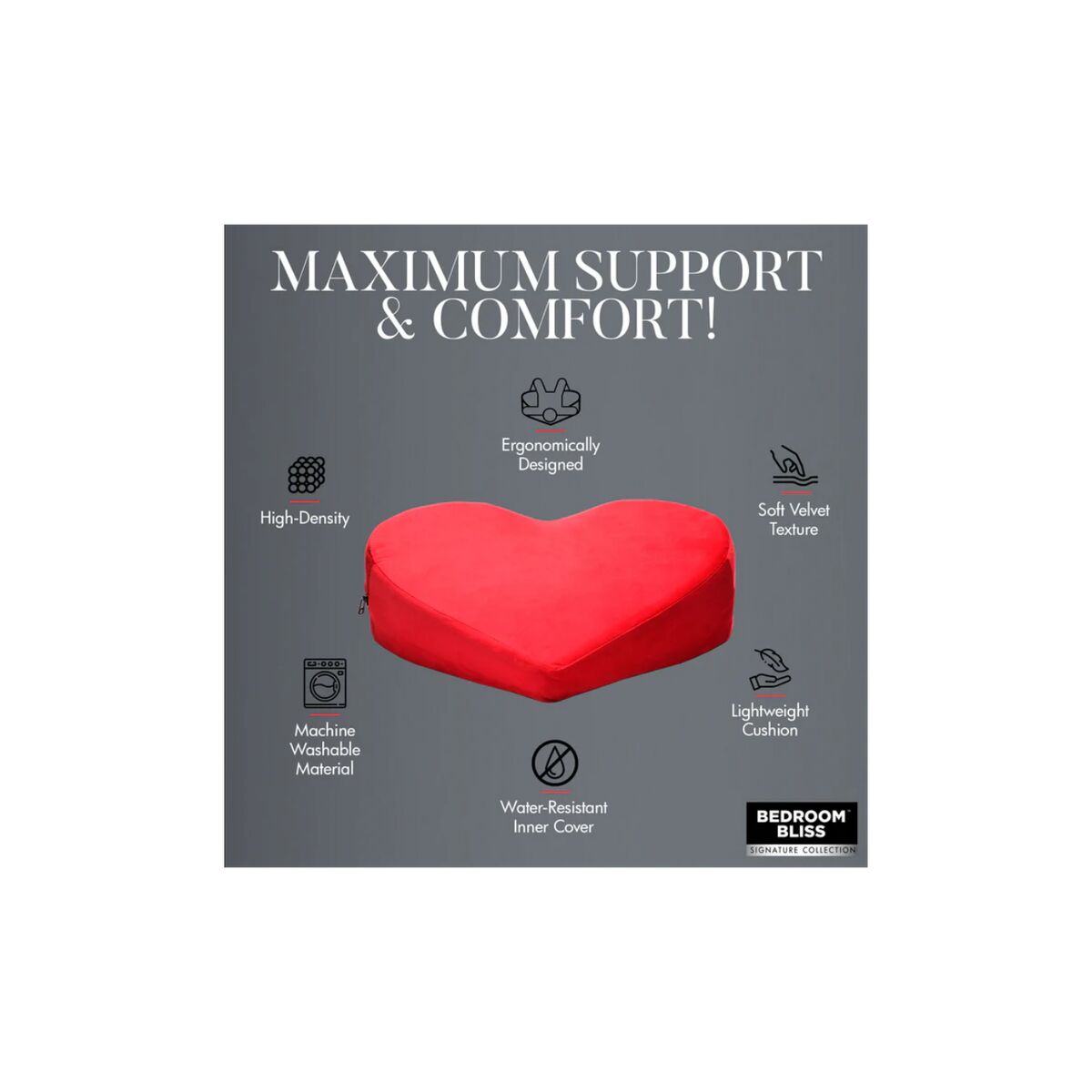 - Il design a cuneo, unito alla forma a cuore, è ergonomico e funzionale. Eleva efficacemente i fianchi per facilitare nuove posizioni e migliorare il comfort, mentre la schiuma interna offre un supporto solido e affidabile senza affossarsi durante l'uso.