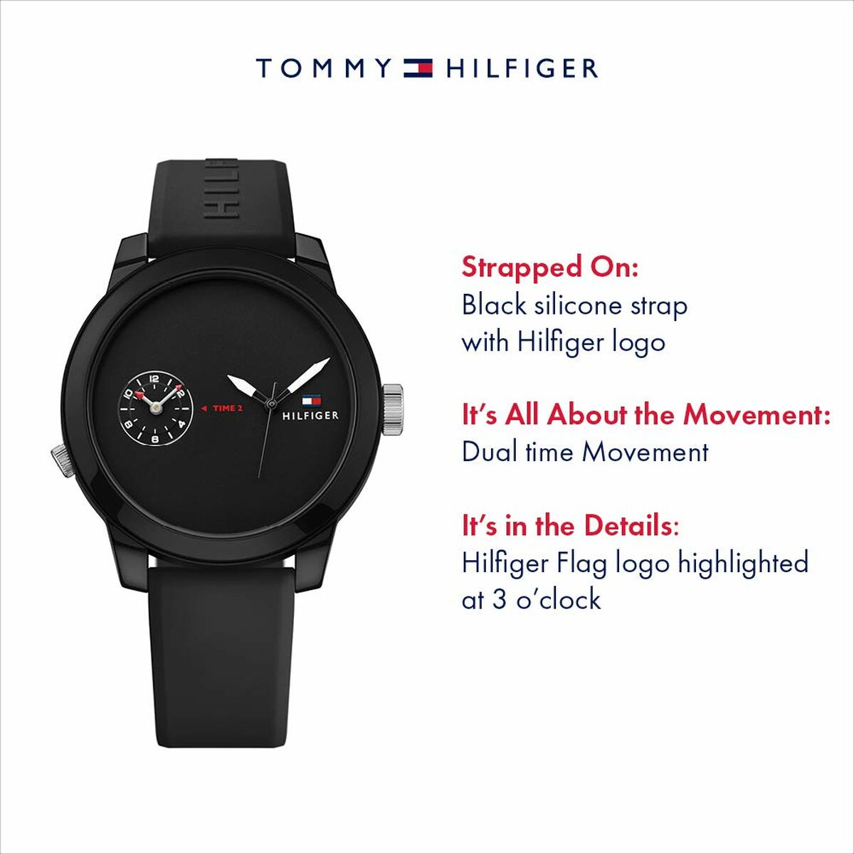 * **Marchio riconosciuto e stile:** Tommy Hilfiger è un brand affermato nel settore della moda, offrendo un orologio con un design casual, moderno e versatile, facilmente abbinabile a diversi outfit grazie al colore nero.