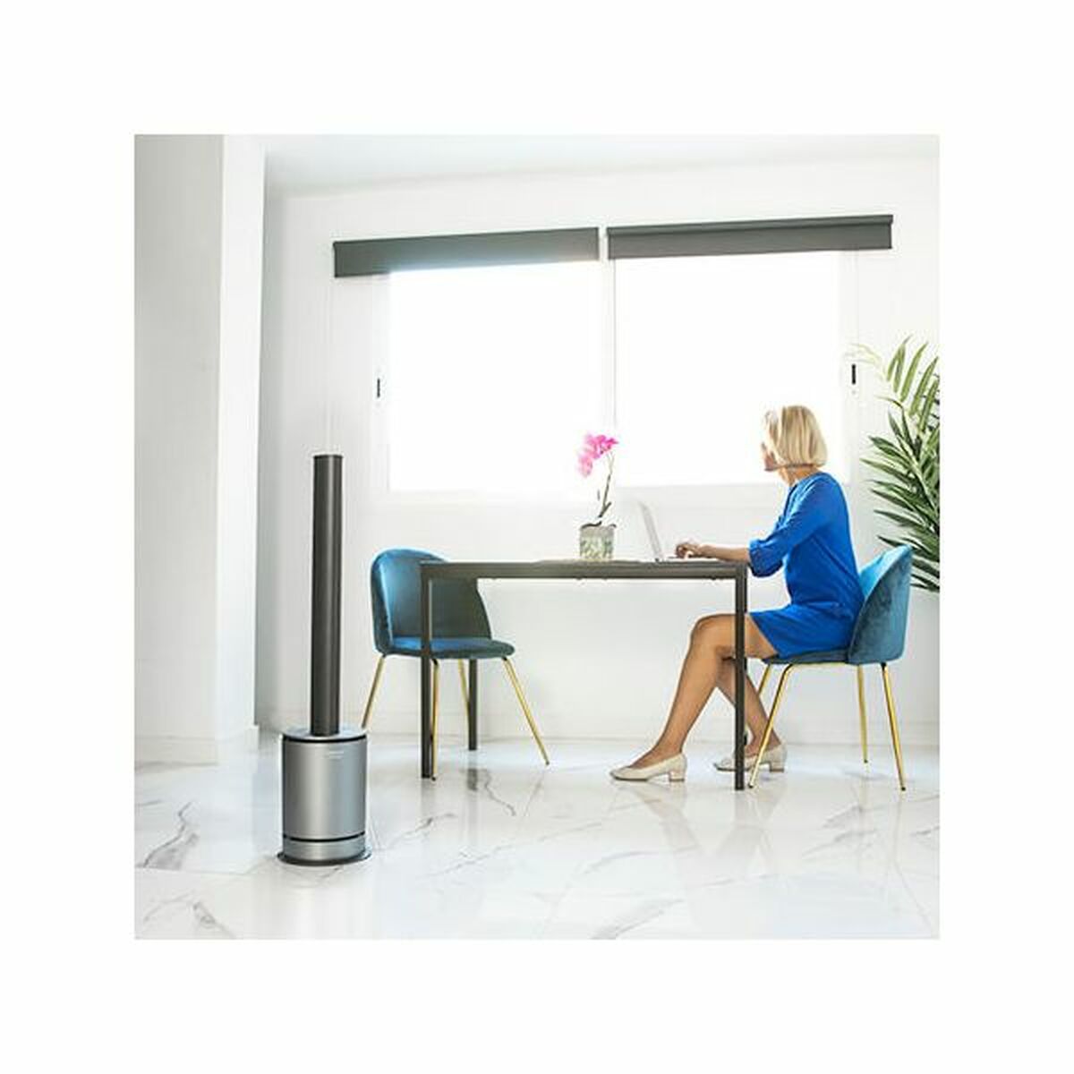 - **Connettività Smart e Distribuzione:** Dotato di Wi-Fi, permette il controllo remoto tramite app per una maggiore comodità. L'oscillazione di 80° assicura una distribuzione uniforme dell'aria purificata, riscaldata o ventilata nell'ambiente.